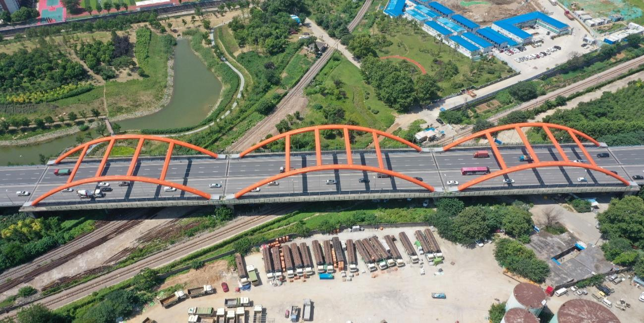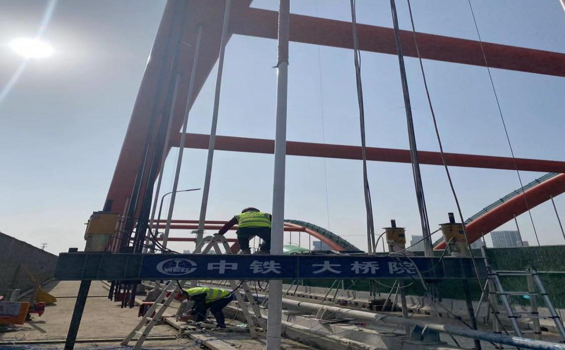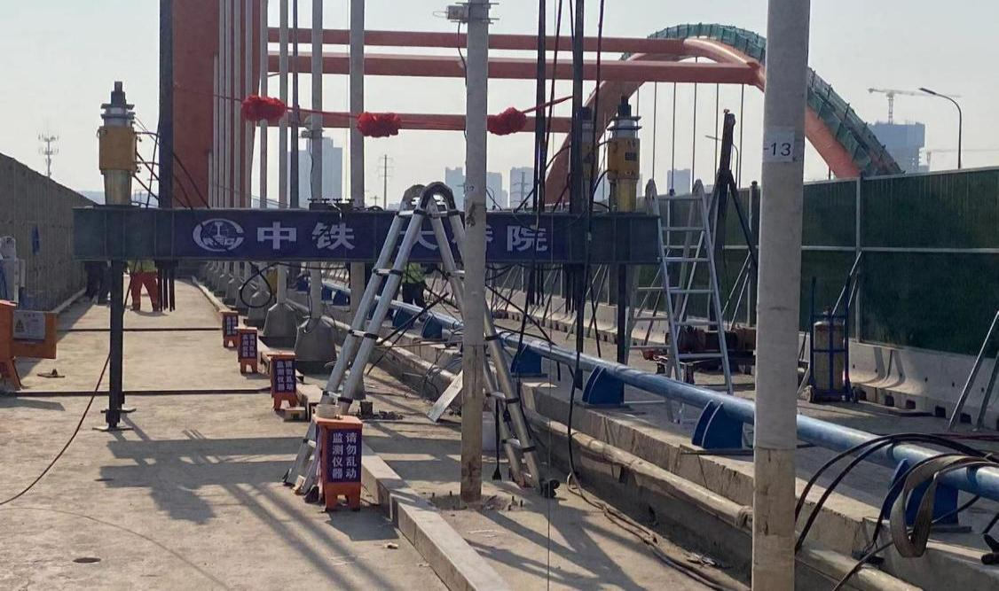 棲霞大橋為城區連接繞城高速主干道上,吊桿更換期間半幅施工,仍然保證6車道通行;且上跨鐵路,13跨橋梁上跨二七油庫線,梁底距離鐵路軌道頂面的間距約為6.8m,14跨橋梁上跨堯興支線鐵路,橋梁梁底距離鐵路軌道頂面的間距約為6.9m,15跨橋梁上口市政道路燕堯路,梁底距離路面的高度為6.09m。